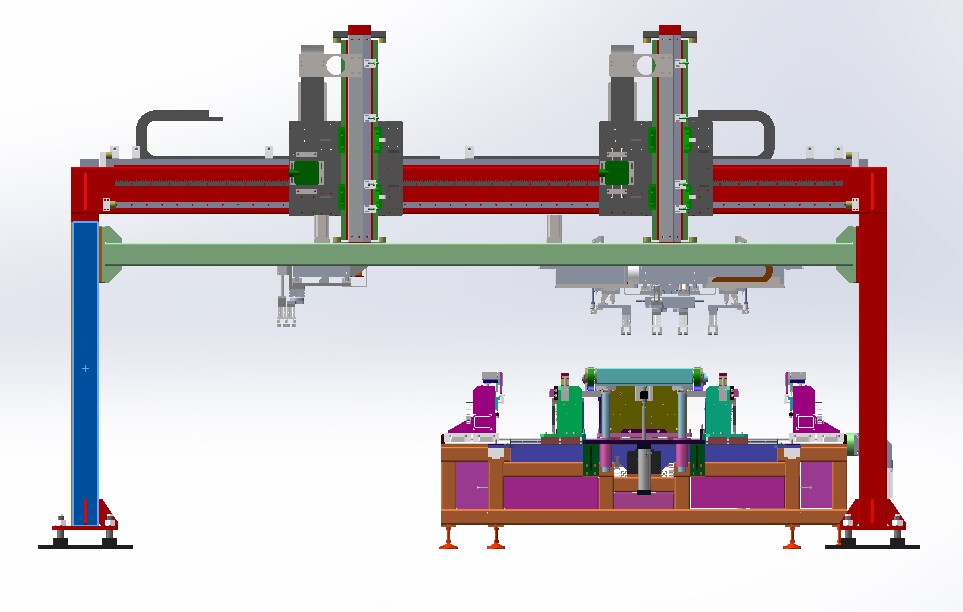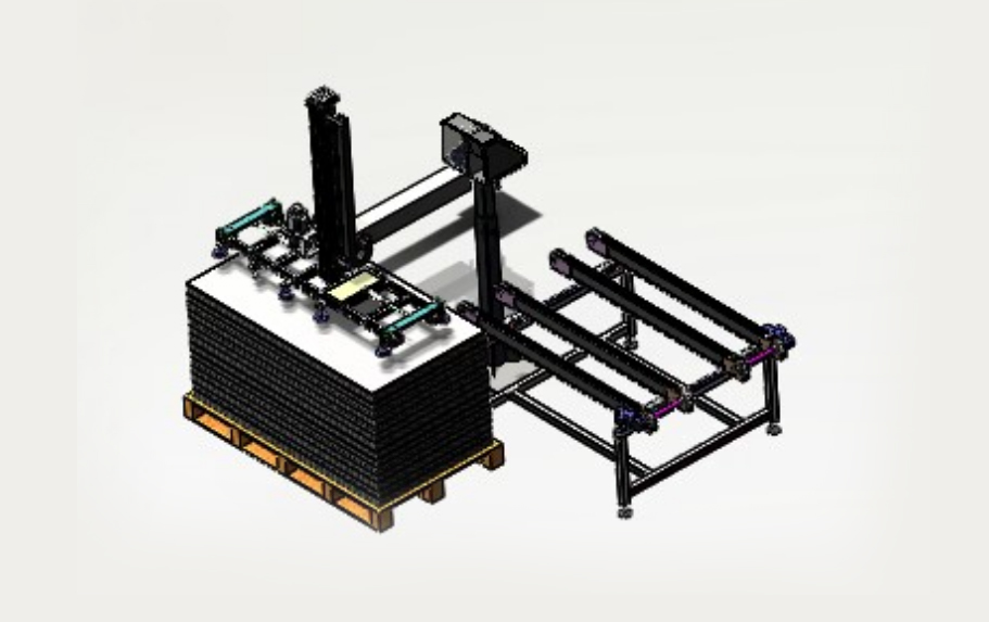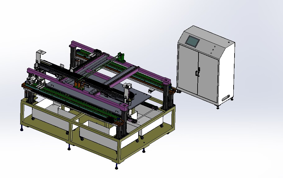 自動(dòng)排版機(jī)的主要功能單元有:玻璃輸送定位系統(tǒng)、抓取行走系統(tǒng)、視覺檢測系統(tǒng)、電控系統(tǒng)等;通過以上功能單元,實(shí)現(xiàn)了將自動(dòng)串焊機(jī)串焊好的電池串,按照工藝尺寸要求和排版方向順序自動(dòng)排版鋪設(shè)到玻璃(EVA已經(jīng)鋪設(shè))上,組成電池串陣列。玻璃/EVA通過傳輸線傳輸至指定位置,機(jī)械手抓取電池串實(shí)現(xiàn)CCD定位、自動(dòng)旋轉(zhuǎn)、自動(dòng)排版功能。設(shè)備通過同步帶傳輸與自動(dòng)生產(chǎn)線對(duì)接,實(shí)現(xiàn)了自動(dòng)流水作業(yè)。